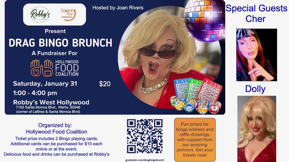 Organized by: Hollywood Food Coalition Ticket price includes 2 Bingo playing cards. Additional cards can be purchased for $10 each online or at the event. Delicious food and drinks can be purchased at Robby's. Special entertainment Joan Rivers, Cher, and Dolly impersonators